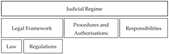 The supremacy of the Constitution over the legal dispositions is guaranteed by the Constitutional Court [44]. When there is a gap or inconsistency between legislations and/or regulations, the issue is solved by the judges through the jurisprudence, developing, in this way, another source of reference apart from the laws and regulations. Hence, the concept of “regulatory regime”, as discussed below in reference to case studies from other countries, is more appropriately referred to as “judicial regime” in the Spanish context, since the term judicial relates to the activity of the courts. This is reflected in Figure 3.