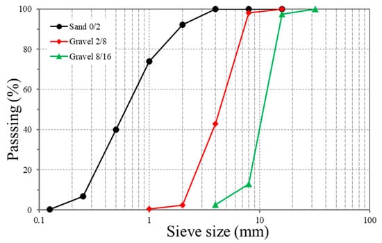 Fly ash (FA), ground granulated blast furnace slag (GGBS), silica fume (SF), metakaolin (MK), and rice husk ash (RHA) were used as the source materials. Two types of SF, SF1 and SF2 and two MK, MK1 and MK2 were used. The chemical compositions of these source materials are summarized in Table 1. The activator solution used is a mixture of sodium silicate and sodium hydroxide. The sodium silicate solution included 26.82% silicate, 8.2% sodium oxide, and 64.98% water. The sodium hydroxide was a 50% by weight solution. Furthermore, a fine aggregate with a maximum size of 2 mm and a coarse aggregate with a maximum size of 8 mm was used. A 16 mm coarse aggregate was also used for the freeze-thaw resistance specimens. In the case of 8 mm maximum aggregate size, 40% fine and 60% coarse aggregate proportion was used, while in the case of 16 mm, 40% fine, 30% 2/8 gravel, and 30% 8/16 gravel was used. The aggregate grading curve for each of the aggregate is as shown in Figure 1.