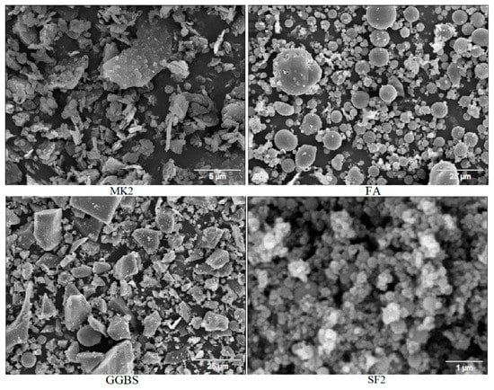 Two types of SF were used, SF1 and SF2. As can be observed from G52M30S18-1 and G52M30S18-5 mixes, SF1 resulted in a higher strength than SF2. The combination of SF1 and MK2 (G52M30S18-5) resulted in the highest strength of all the mixes investigated in this study. In terms of chemical composition, SF1 and SF2 show no significant difference. The higher performance of SF1 could be from other factors such as fineness, morphology, or reactivity.