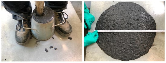 As concrete’s workability is of high importance for application, the mixes were targeted at getting good workability in the range of F4 and F5 according to DIN EN 206 []. Figure 3 shows G50M33R17-11 mix during the workability assessment.