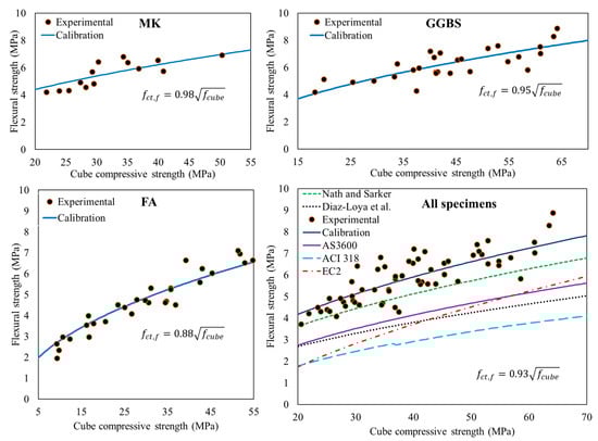 A least-square optimization was also performed on the experimental results for each of the MK-, GGBS-, and FA-based mix and for all the mixes together. As shown in Figure 4, a variation was observed on the calibration coefficient between the different mix types. MK-based mixes resulted in the highest flexural strength, which is approximately the square root of the cube compressive strength. On the other hand, the FA-based mixes resulted in the lowest flexural strength, which is about 0.88 times the square root of the cube compressive strength. This could be due to the particle shape of the source materials. MK as can be seen in Figure 2 has a plate-like morphology while FA has a spherical morphology. Equation (12), when converted to cube strength, has a coefficient of 0.81. This is close to the FA-based mixes than the other mixes. This is because Nath and Sarker’s [] mixes are FA-based concretes, with a minimum of 85% FA and a maximum of 15% GGBS.