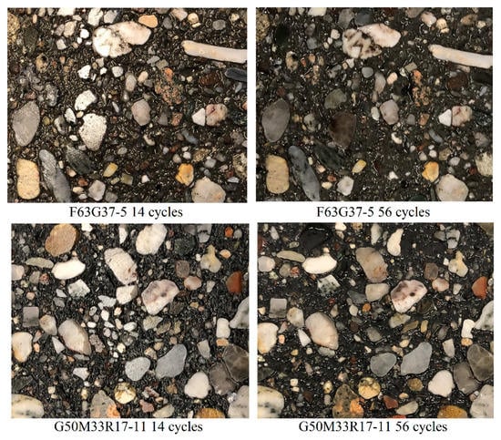 In this study, freeze-thaw resistance was tested according to DIN EN 12390-9 using the capillary suction of deionized water and freeze-thaw test (CIF) method. Two mixes, i.e., F63G37-5 and G50M33R17-11 were tested. For each mix, five samples were tested. The scaled mass was measured at 14, 28, 42, and 56 cycles for each sample. Table 5 shows the average total scaled mass for each of the specimens at different cycles. Figure 5 shows some of the specimens at the 14 and 56 freeze-thaw cycles for both F63G37-5 and G50M33R17-11 mixes.