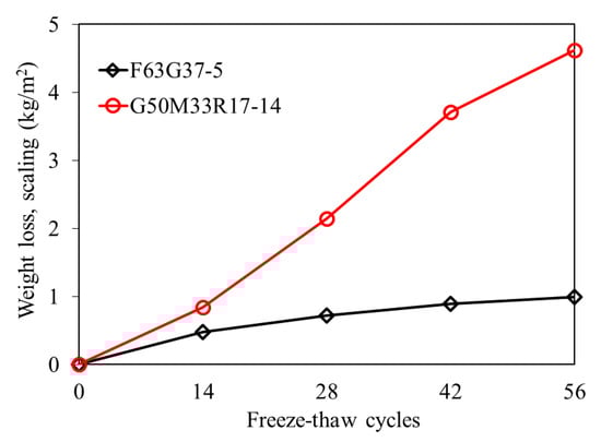 Setzer and Auberg [], in their scaling test study, found that all concrete meeting strictly all the design specifications of standards have a mean scaling below 1.5 kg/m2 at 28 cycles. Hence they recommended this value to classify a high freeze-thaw resistance concrete. Mix F63G37-5 met this requirement with a scaling of 0.7 kg/m2 at 28 freeze-thaw cycles and even at 56 cycles with about 1.0 kg/m2 scaling. Mix G50M33R17-11, on the contrary, has a scaling factor of 2.1 kg/m2 at 28 cycles hence did not meet the requirement.