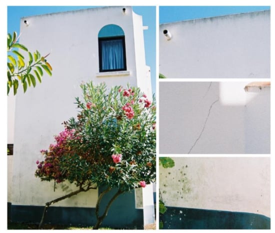 Collecting information from fieldwork about natural degradation of building elements, is an alternative to laboratory tests like artificial weathering cycles. The fieldwork survey could be very useful to compare with the laboratory tests, since it allows identifying the real-life effects of weathering on the performance of building elements, considering the simultaneous effects of different climatic degradation agents [,,,]. In facades, the degradation condition could be assessed from visual inspections, which involve a non-destructive inspection method. This type of analysis is a natural way to judge the service life of these constructive elements since the maintenance decisions are made based on this type of assessment [,]. In that context, several works have been developed, concerning the degradation of buildings and their elements, based on visual inspections [,,,]. These studies can be complemented by some expedient tools, like binoculars to get a closer observation, a tape measure to obtain some dimensional information, a crack with a ruler, and a colour system sample []. Other additional diagnosis techniques can also be applied, whether they are non-destructive or destructive techniques. However, visual inspections intend to be easily applicable in practice and without high costs.