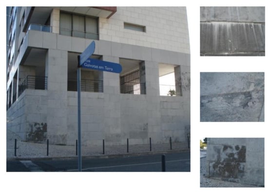 Figure 2 describes another case study, a natural stone cladding, directly adhered to the substrate, which was inspected using the global inspection system. This case study refers to a building located in Parque das Nações, Lisbon (Centre of Portugal). The façade is oriented toward the east and presents an average level of protection against the combined action of wind and rain. In terms of environmental factors, the inspected building is located at less than 3 km from the sea, in an urban environment, and exposed to unfavourable conditions of air temperature and relative humidity. The total area of the facade analysed is 75 m2 and the natural stone cladding is 12 years old.