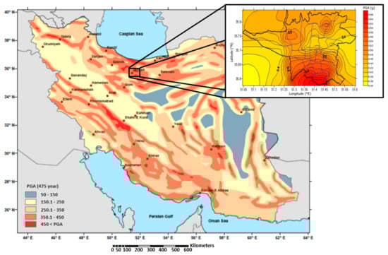 Building failures are the major cause of fatality and economic loss due to earthquakes [2]. Public facilities, such as health care clinics and hospitals, have a critical role during the post crisis management of disasters; it is essential to assess their seismic vulnerability in order to have realistic preparation, response–action strategies, and effective earthquake hazard management. Casualty rate increases are reported for weaker buildings within high seismic risk zones [2]. For instance, Iran’s Bam earthquake was more catastrophic than California’s Paso Robles earthquake; although the magnitude was similar, the building designs complied with codes strictly in United States compared to other regions [2]. Figure 1 demonstrates the seismic hazard map of Iran based on correlation with the metropolitan area of Tehran. This map is based on peak ground acceleration (PGA) for a return period of 475 years [12].