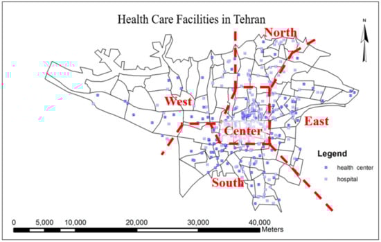 Distribution of the hospitals and health care facilities in the Tehran metropolitan area.