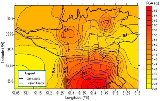In order to estimate the potential damages in the worst case scenario condition, the existing fragility curves for different types of hospital buildings in Tehran metropolitan are compared at an average peak ground acceleration (PGA) for the city of Tehran. For this purpose, the hazard map of surface PGA considering the shear waves within 30 m from the surface, and with a 475-year return period is used to select the average PGA for comparison and normalization of the damage probability matrices [39,40,41]. Figure 3 shows the seismic hazard map of Tehran on the surface for a 475-year return period [40]. According to Figure 3, the average PGA for the entire city of Tehran is 0.5 g and this average for the five major districts varies within 0.4 g to 0.6 g. Hence, 0.5 g is used for comparison and normalization. Later, the PGA of each region is used in the vulnerability analysis of hospitals.