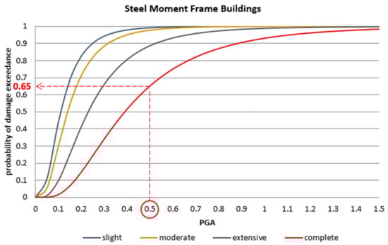 In order to demonstrate the method of comparison, the fragility curves of HAZUS for common steel movement frame buildings in four damage states are shown in Figure 4. It can be seen that for an average PGA of 0.5 g, the probabilities of the damage exceedance are 65%, 90%, 97%, and 100%, respectively, for the complete, extensive, moderate, and slight damage states. The damage probabilities for other fragility curves were estimated similarly and listed in Table 4, Table 5 and Table 6.