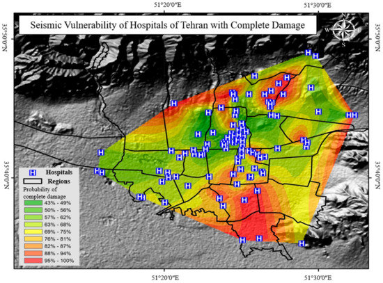 Seismic vulnerability of hospitals of Tehran for the complete damage state. The probability of failure of hospitals during an earthquake with the estimated PGA based on a 475-year return period scenario.
