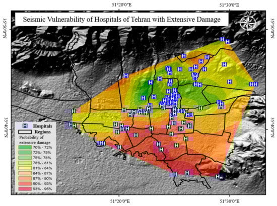 Seismic vulnerability of hospitals of Tehran for extensive damage. The probability of 50–100% damage to hospitals during an earthquake with the estimated PGA based on a 475-year return period scenario.