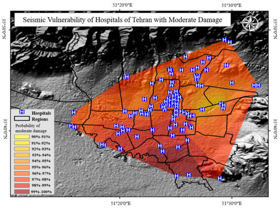 Seismic vulnerability of hospitals of Tehran for moderate damage. The probability of 10–50% damage to hospitals during an earthquake with the estimated PGA based on a 475-year return period scenario.