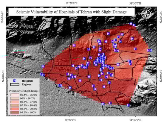 Seismic vulnerability of hospitals of Tehran for slight damage. The probability of 0–10% damage to hospitals during an earthquake with the estimated PGA based on a 475-year return period scenario.