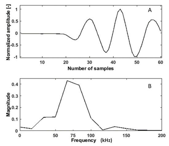 There are several NDT techniques commercially available in the market [3]. Ultrasonic pulse velocity (UPV) and Acoustic emission (AE) are the most reliable techniques that are currently used for diagnosis of RC structures [4,5]. Lu et al. [4] showed a high probability of detecting damage with temperature variation. Although AE is reliable technique that gives information much earlier than the visible opening of cracks, the interpretation of observed AE events is always a difficult task. Hence, it is difficult to distinguish AE events (due to microcracks) from background noises during the initial stage of loading. This is because most AE events occur just before the propagation of microcracks [6]. On the other hand, the active techniques based on using ultrasonic sensors are more reliable to detect cracks due to the relationship between ultrasonic wave propagation and initiation of cracks [7]. However, the traditional UPV technique has some limitations, as it needs a trained operator and is difficult for continuous monitoring [8]. To overcome these limitations, BAM (Bundesanstalt für Materialforschung und -prüfung) designed new embedded ultrasonic sensors which were manufactured by Acoustic Control Systems company, Moscow, Russia [9]. These new sensors are easy to install during concreting procedures and also on existing civil structures. The uniqueness of these sensors is their low-frequency band with the center frequency of 62 kHz and bandwidth of 100 kHz, compared to typical ultrasonic sensors for testing and monitoring of concrete structures available in the market. This is suitable for most of the structures, as the size of aggregates is less than the wavelength. The exemplary time and frequency domain of first arrivals from a signal is shown in Figure 1. The ultrasonic guided waves have been used for many structural health monitoring (SHM) systems. However, the guided wave is more suitable for steel structures. The diffuse ultrasonic wave is a very promising method for structural (RC structure) change detection, as a signal coming from a longer path contains more information compared to the first arrival [10].