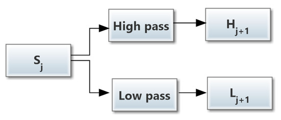 where and are the impulse responses of low-pass and high-pass mirror filters. The jth level of decomposition is shown in Figure 2.The decomposition formulas of NDWT are as follows: