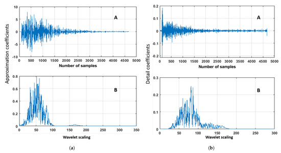 Ultrasonic signal (recorded by sensors combination S01R04) after wavelet decomposition in time (A) and frequency (B) domain. (a) Approximation coefficients after high wavelet scaling. (b) Detail coefficients after low wavelet scaling.