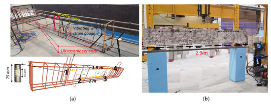 During casting, four ultrasonic sensors and two vibrating wire strain gauges were embedded inside the beam in such a way that one can follow the changes in concrete [40]. The location of the sensors can be seen in Figure 4a. The number and position of ultrasonic sensors also can be seen in Figure 4a. The curing period was 28 days at a temperature of ± 2°. The LVDT was placed vertically in the middle of the beam to measure the deflection of the beam during the four-point bending test.