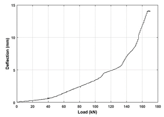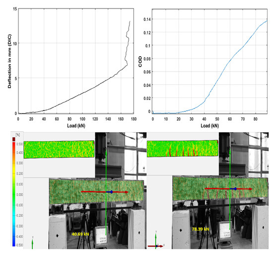 During the four-point bending test, the loading procedure was performed in a continuous manner; the loading step was approximately 1 kN for each minute until 120 kN, then it was increased by 5 kN for each minute. The deflection of the beam can be seen in Figure 6. One can see that the deflection of the beam lost linearity around 42 kN due to crack formation. The crack opening and propagation can also be observed from the DIC measurements (see Figure 7). The middle deflection and crack opening displacement (COD) was also analyzed through DIC measurements. The displacement fields were used to determine the COD value. The discontinuity of two points in the middle of the beam by following the crack path was used to calculate COD values, the transform of the dissipated energy, and the crack opening along the crack path was measured (anticipating the crack opening width vs. depth line to zero). The COD values were considered until 90 kN, as all the cracks appeared during this loading period. It is also visible from the surface image that at 40 kN the first crack appeared, and all the cracks formed during 80 kN.
