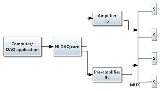 The new data acquisition system was used to acquire ultrasonic signals during the loading program (more details about the data acquisition system can be found in [42]). The simple block diagram is shown in Figure 8. An NI DAQ card generated the pulse signal to excite the ultrasonic transmission sensor. On the other hand, a pre-amplifier was used to record the good quality of signals. The data acquisition system recorded eight measurements (ultrasonic signals) in each minute.
