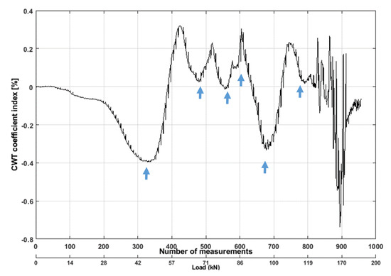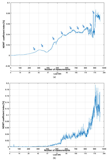 In this study, two pairs of sensors located on the top and bottom of the beam were analyzed. First, NDWT was applied to the raw ultrasonic signal time histories, acquired from the top pair of the sensors. The NDWT coefficient was increased (high scaling) during the initial phase of the loading. The coefficient was started to decrease after 42 kN. It should be noticed that the cracks started forming in that period. When the crack started forming, the low-frequency components of the waves propagated with attenuation, and high-frequency components were scattered. It can be observable in Figure 10b. The observed values (coefficients) lost linearity after around 68 kN, when most of the cracks were formed and started to propagate. Also, the value of coefficients was not linearly increased comparing with the continuous loading period. Therefore, this low wavelet scaling part of the result can be avoidable. The authors [28,43] also used a band pass filter to remove the high-frequency component from the diffuse ultrasonic signals. However, one can see in Figure 10a that the NDWT coefficient started to lose its linearity after 42 kN, which indicates the cracks forming and propagation (marked with the blue arrow). From the literature, the simulation of ultrasonic surface wave indicates similar results [14]. This pair of sensors was located on the top portion of the beam. Therefore, these results were not surprising. The cracks were formed first on the bottom side of the beam; therefore, the influence of the signals was lower.
