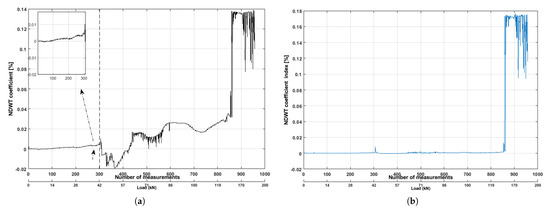 The NDWT coefficient extracted from the bottom pair of sensors can be seen from Figure 12a. The coefficient increased slowly until 33 kN. Then, a sudden decrease can be observed due to forming microcracks. Due to the influence of micro-cracks, the approximation coefficients of signals first caused a noticeable decrease after 42 kN. One should remember this was the period when most of the cracks started to form. The changes of this coefficient were linear after 50 kN. However, several non-linearities can be observed when the new cracks started to form. There were no noticeable changes observable from the detailed coefficients resulting from NDWT. This is due to the sensor locations in the beam, as all the micro-cracks formed on the bottom of the beam.