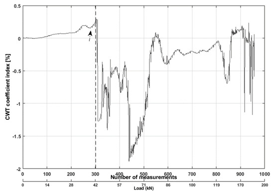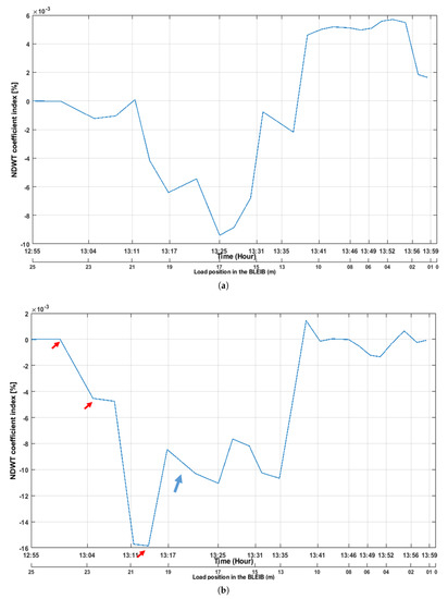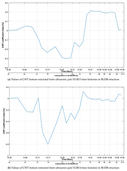 The NDWT coefficient for S12R14 (S12 transmit ultrasonic signal and R14 receive the diffuse signal) can be seen in Figure 15b. The coefficient changed during each loading step in the structure. The coefficients were steady for some period on each loading step (marked with the red arrow in the Figure 15b), and, the result was as expected, as the quasi-static load stayed for 1 min on each position in the beam. The NDWT coefficient increased its highest values after the load was placed at 21 m of the structure. Then, it suddenly dropped to 0.008%, when the load was placed at 19 m of the beam. It is remarkable, as the load was placed in the crack position during this period. The cracks were between sensor numbers S12–S14 in the same beam. This indicated that the coefficients’ sudden decrease was due to cracks openings. As the cracks opening influence the low-frequency component of the signals. The coefficient values stopped increasing due to cracks opening in the structure, and after the load moved to sensor number S12 (which was transmitting the ultrasonic signals), the influences in the signals became less. The NDWT coefficient was sensitive to detect the load, even during the initial phase of the loading when the load moved at 21 m in the structure. The CWT coefficient values increased when the load firstly moved and was placed 1 m from the edge of the structure. Then, the coefficient suddenly started to drop when the load moved to 18 m of the structure where the cracks were located. The changes in CWT coefficient were again recognizable when the load was placed at different cross-section (where sensors 01–08 were situated), but the influence was less as the load was far from the measuring sensors. However, both coefficients can detect the cracks, load and each step of the load in the structure.