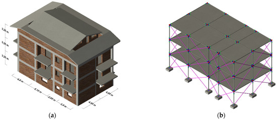Case-study building (a) solid view and (b) finite element model (adapted from Gaetani d’Aragona et al. [68,69]).