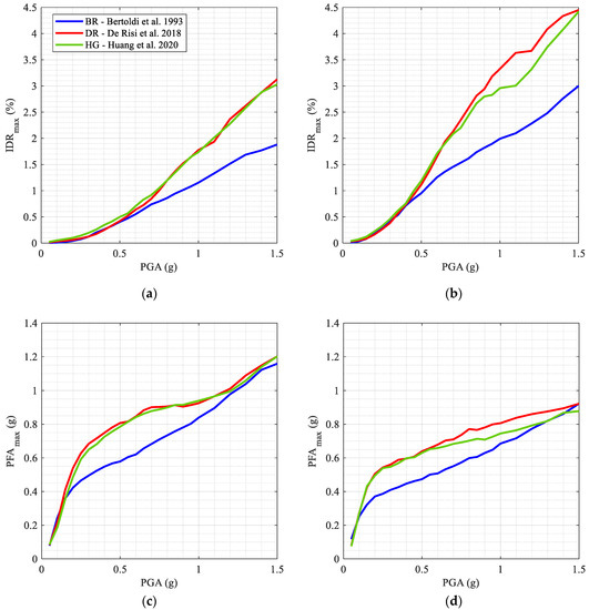 In the longitudinal direction (Figure 11c), three backbone curves predict similar PFAmax up to PGA = 0.15 g. While DR and HG produce PFAmax very close to each other for every intensity, for PGA ≥ 0.15 g they distance from BR for joining up again for PGA ≥ 1.2 g. This trend occurs also in the transverse direction (Figure 11c), but DR and HG predictions tend to diverge for PGA ≥ 0.5 g.
