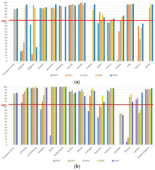 Recovery rate of construction and demolition waste in EU member states in the period 2010–2018, (a) EU, Belgium––Latvia, (b) EU, Lithuania––United Kingdom [13] (Eurostat, 2020).