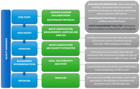 Pre-demolition audit of construction and demolition waste should be carried out before renovation or demolition works begins. The methodology (Figure 3) of its processing is recommended according to “Guidelines for the waste audits before demolition and renovation works of buildings” [38]. The document sets out the content of the individual steps.