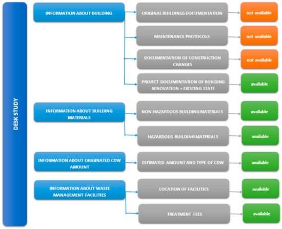 Construction and demolition waste audit before demolition and renovation works were implemented for the shopping center building in the Snina town. Considering that the object of CDWA is also the object of a case study, more detailed information about this building and renovations and demolition work is given in the Research Material section. An initial step of CDWA is the desk study (Figure 4).