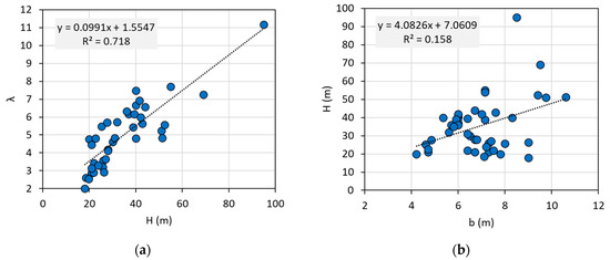 Correlation of geometrical properties (H—height; b—base width; λ—slenderness) from different masonry towers in the Italian territory from literature, (a) the correlation between the height of the structure and slenderness, (b) the correlation between the base width and the tower’s height.