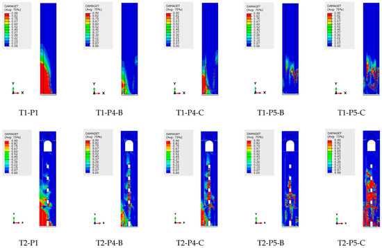 The tower’s geometry is crucial in obtaining a reliable result on the seismic response of the structure. A comprehensive study on the geometrical aspects’ role based on simplified numerical models can be found in this literature, [65], where different failure patterns have been observed. The role of the geometry here is not fully comprehensive due to the limited number of the studied towers. However, it highlights the role of structural features like the presence of openings or horizontal elements. Figure 6 confronts the hollow tower T1 with tower T2, where the last is expected to be more realistic. The reported results correspond to the material M3, but it is remarkably similar to the results of M2. Compare Figure A8 with Figure A9 and Figure A11 with Figure A12. Initially, a concentration of damage in the zone under compression (tracked by the P4 and P5 load pattern approach) can be observed. This highlights the possibility that the initiation of the collapse mechanism could result from combined compressive and shear stresses, which is not the most intuitive one when dealing with low tensile strength materials. Case P1 highlights the damage that is extensively spread in the tensile zone. Besides the load pattern influence, this overall behavior is also affected by the ratio of the cross-section, the wall thickness, and the slenderness. It is worth noting is that the concentration of the damages is not close to the base, but almost to 1/4 of the height. This effect is also observed in a real case study, San Giorgio Tower in Ferrara (Italy). Because of the geometry and the present inclination of the tower, many conducted nonlinear time history analyses have highlighted the initiation of a failure pattern with a diagonal crack shape in the compressed side located almost closes to the 1/4 of the tower’s height [26].