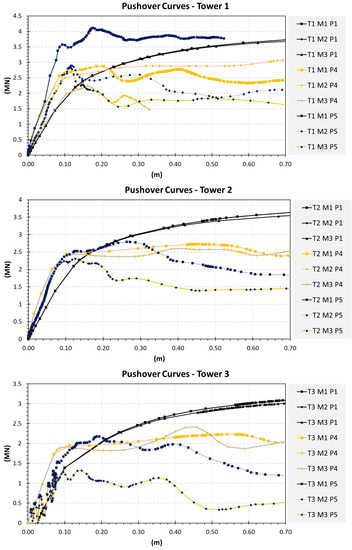 As expected, a full nonlinear dynamic will cause oscillations of the structure during the initial steps of the numerical simulation, where it occurs that the structure is in the elastic phase. These observed oscillations in the initial branch, which are clearly distinguishable for Tower 3 in see Figure 7, make it difficult to segregate a linear branch representing the elastic phase of the pushover capacity curve. Approaching the pushover analysis according to the herein considered P5 load pattern is not always reliable for obtaining pushover capacity curves, as mentioned in the previous paragraph.