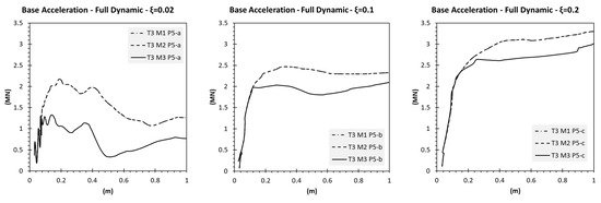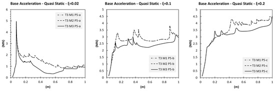 Role of damping in the quasi-static pushover curves, from left to right the damping ratio increases from 0.02, 0.1 and 0.2.
