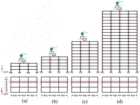 This section texturizes that the buildings are originally designed based on Korean Building Code (KBC) 2016 [] by space frame with 3 bay (5 m width) in the z-direction, which is perpendicular to the drawing (Figure 1). Then the two-dimensional numerical concrete moment-resisting frame layout as shown in Figure 1 has been taken to analyze the effect of TMD. The frame layout from the three-dimensional building with story numbers of 3, 5, 10, 20 is modeled using OpenSees []. During the design, the dead load and the live loads were 4.6 and 2.5 kN/m2, respectively [,]. The basic content of the designed wind load and seismic load based on KBC is explained in Table 1.