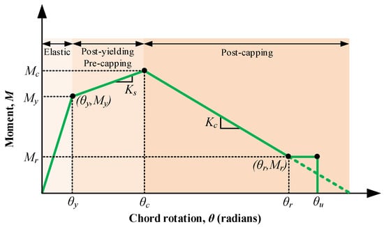 The concentrated plasticity model approach is used to represent the non-linear behavior of the beam-column element through two end springs (rotational), which are connected by an elastic element. This rotational spring employs a bilinear material model based on the modified Ibarra Krawinkler Deterioration Model [,] as shown in Figure 2 obtained from [].