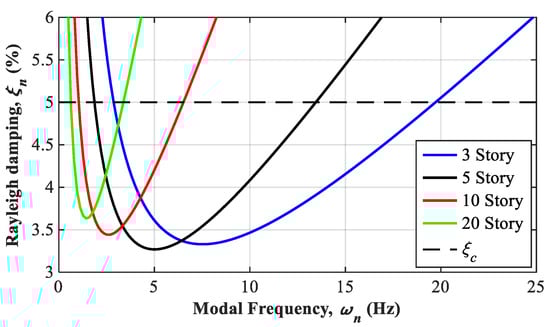 where and are the natural frequencies for the ith and jth modes, respectively, and where the 1 and 3 modes are represented in this study as the ith and jth modes, respectively. The Rayleigh damping using Equation (1) for the considered 4 buildings is shown in Figure 3.