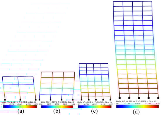 Through modal analysis, the vibration period (T) of the building frames is computed in the elastic range for the 1st mode of each building and listed in Table 2. According to Moniri [], the modal frequencies in a nonlinear system are continuously changing after entering the inelastic range. It is not possible to provide each step’s natural frequencies after yielding the structures so that only the modes for the elastic range are enlisted in Table 2 and the fundamental mode shapes are shown in Figure 4. The building frame was modeled by OpenSees and post-processing and visualization were carried out by the FeView tool [].