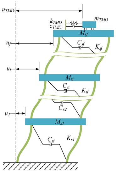 TMD consists of a mass (, a spring (stiffness,), and a damper (damping, ) that is attached to the building as shown in Figure 5. Considering the TMD is placed at the top of the building frame, the governing equation for the building frame (as primary structure) and the TMD (as a secondary component) can be expressed as Equations (4) and (5), respectively.