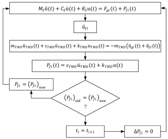For the numerical approach, the effectiveness of TMD is explained in Figure 6. The interactive force () at the initial stateof each time step is assumed to be null. The incremental acceleration of the story () is added to incremental acceleration activated on the base () to form the total excitement acceleration applied to TMD. The equation of motion for TMD leads to determine the incremental values of acceleration, velocity, and displacements of TMD as shown in Figure 6. To measure the effectiveness of the TMD, the seismic response of the building frames with and without TMD subjected to ground motion with different frequency contents are analyzed and compared to each other.