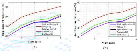Comparison of the structural response for measuring the effectiveness of TMD: (a) displacement reduction; (b) acceleration reduction.