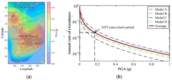 Seismic hazard evaluation: (a) seismicity maps in the Korean peninsula for 2475 years returned period; (b) seismic hazard curve in the building site (Gunsan-si, South Korea) for four seismic models in South Korea.