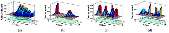 Disaggregation plot for most contributing earthquake range selection from four seismic source models in Korea: (a) model A; (b) model B; (c) model C; (d) model D.