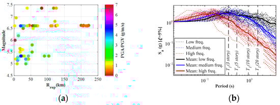 This section focuses on the GM selection criteria, as well as the specific GM category that depends on the frequency characteristics. Frequency characteristics of GM correlate with the ratio of peak ground acceleration (PGA) to peak ground velocity (PGV), and account for many seismo-tectonic features and seismic site effects []. Three categories of ground motions were selected based on the PGA/PGV according to earlier research [,,].