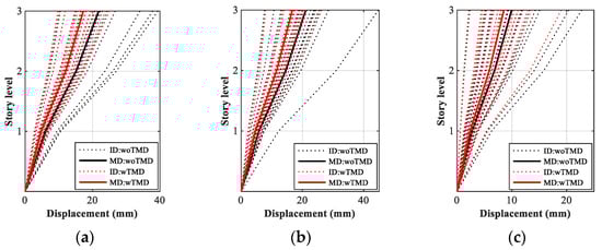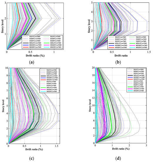 The results of the analyses of building frames affected by GMs with low, medium, and high-frequency characteristics are presented here. The response, including inelastic effects, was evaluated. As the TMD parameters from Rüdinger [] can perform better (Figure 7), for further analysis those parameters were used to get more effective results. Selected GM records were applied to the horizontal direction of the numeric model as the input seismic excitations. The result analysis comprises plotting and comparisons of peak story displacement, inter-story drift ratio (IDR), and fragility curves.