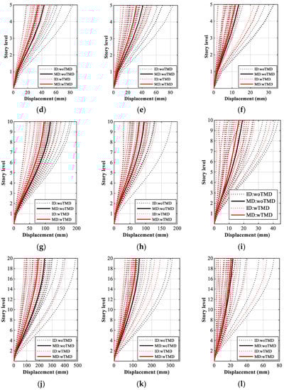 Story displacement of building frames under different categories of GMs: (a) 3 story (LFC); (b) 3 story (MFC); (c) 3 story (HFC); (d) 5 story (LFC); (e) 5 story (MFC); (f) 5 story (HFC); (g) 10 story (LFC); (h) 10 story (MFC); (i) 10 story (HFC); (j) 20 story (LFC); (k) 20 story (MFC); (l) 10 story (HFC).