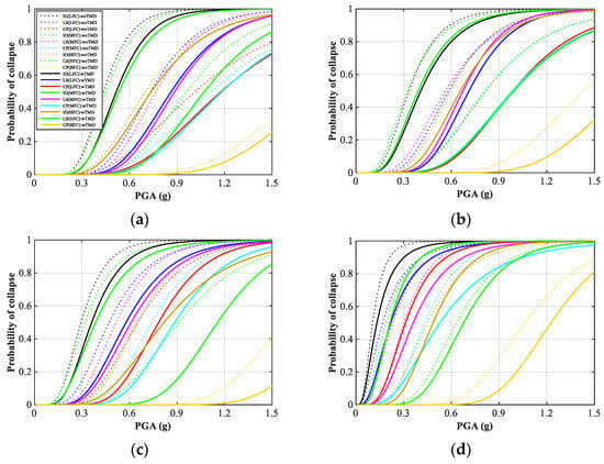 Fragility curves equipped with and without the TMD building frame: (a) 3 story; (b) 5 story; (c) 10 story; (d) 20 story.