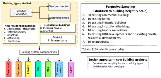 Case and field studies of commonly occurring problems in Basements and Wet Areas of a total of 110 buildings comprising of commercial, hotels, industrial, institutions, healthcare facilities, and residential facilities were conducted. The multiple case studies involved three major broad classifications of building types as non-residential buildings, residential buildings, and districts (estates/parks). Each of them was categorized into seven building components/system (e.g., basement, wet areas, facades, roof, M&E, common areas, and green technologies). The building types, building system categorization, samples, and sampling of buildings are shown in Figure 2. Typical configurations of Basements and Wet Areas investigated are the conventional types as shown in Figure 3 and Figure 4.