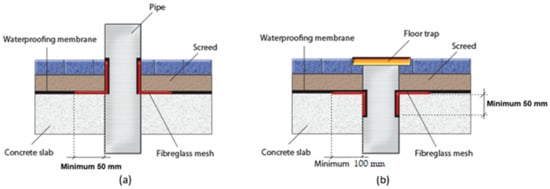Conventional Wet Area waterproofing details at (a) pipe penetrations and (b) floor traps.